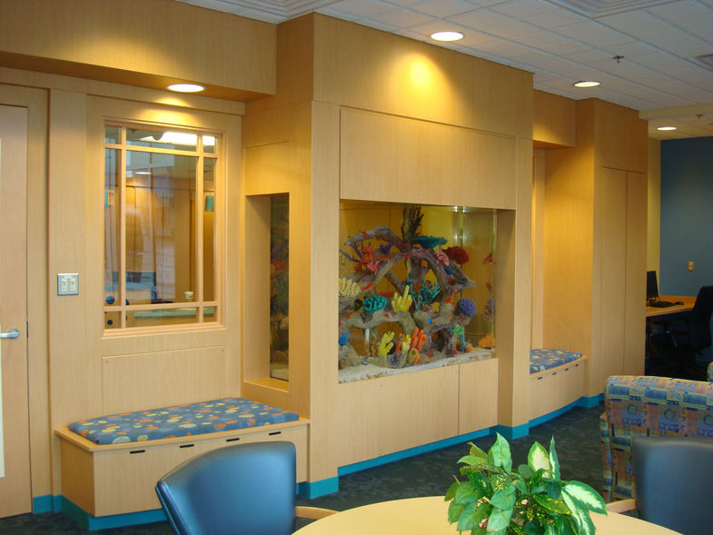 This renovation emphasizes a new image for the UMass Memorial Medical Center Children’s Hospital by incorporating new logo and signage with a lobby renovation that includes a new reception desk and a new Ronald McDonald Family Room. Located immediately at the entrance to the Children’s Hospital, the Family Room provides a comfortable refuge for parents by allowing them an area for a quick snack, an opportunity for a quiet cup of coffee, and a chance to check email or make phone calls away from the child’s bedside, yet immediately adjacent to the patient rooms. A large aquarium serves as a focus for the lobby as well as the Family Room, and the playful theme is continued in the design of the reception desk and lighting fixtures, as well as the application of finish materials.